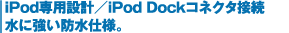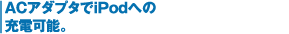 付属のACアダプタで使用した場合にはiPodへの充電も可能です。 ※ACアダプタで使用した場合には防水仕様にはなりません。