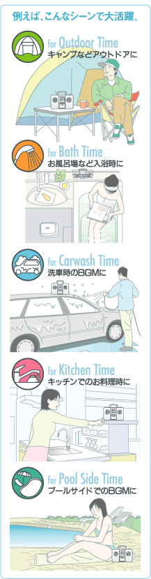 ◆「部屋に帰ってiPodをスピーカーで聞くときにiPodの充電ができるし、そのままお風呂に入るときに持っていくというスタイルが便利でオシャレ。お風呂もだけど、キッチンや水周りのことをしながらも安心して使えるのが便利です。」 ◆ 「海やプールだけでなく、ちょっとしたドライブのときも(FMトランスミッターで充電)、このスピーカーならiPodの内蔵電池でも聞けるから乾電池を使わず経済的なところがうれしい。もちろん急な雨や濡れた手で触っても安心だから携帯できるスピーカーではピカイチ!」 ◆ 「持って歩けて、水がかかっても心配ないし、充電もできて乾電池もあまり使わない。iPodをスピーカーで気軽に聞くというニーズにぴったりです。」 ◆「iPodが守られてる感じが安心!」といった印象的なご意見もありました。